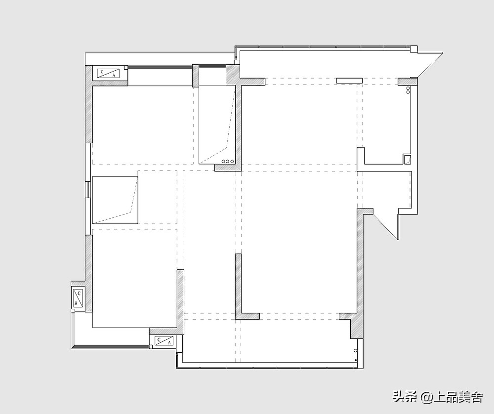 入户玄关方式处理的很好,家里面全部都是承重墙,因为我们接手设计的时候,业主已经叫人把能砸掉的墙体全部砸掉了,所以整体很空旷,从原始结构看上去是一个简单的两居室户型,但是业主的要求是要做到三房,因为业主有一儿一女,户型的整体评价还是不是很好,147平米的实际面积,居然只有两个卧室。
