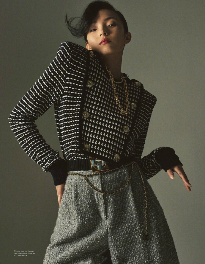 除了偏暗色系的穿搭以外,这次封面中也是有亮色系颜色点缀着的,要来的更为吸睛且夺目的雎晓雯身穿一条紫红色连体裤,帅气逼人的皮质是非常中性的,有点酷酷的连体衣可不是女人味的颜色也可以掩盖掉的。